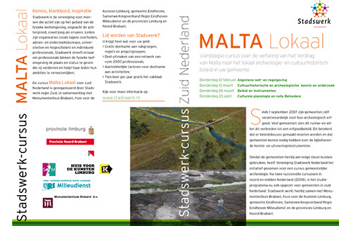 Stadswerk organizeda four-day course on the translation of the Treaty of Valletta (Malta) into archeology and cultural history policy on a municipality level in 2009. Marc Kocken acted as guest lecturer and appealed to cultural planning and making the archaeological heritage visible and liveable in the public space.