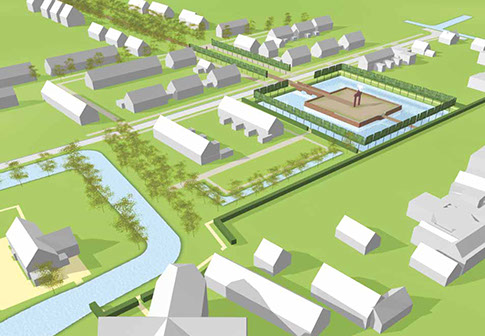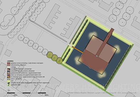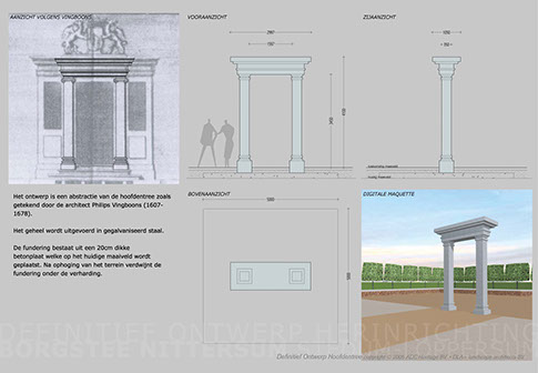 The preliminary design of ADC Heritage (Marc Kocken) and DLA+ (Harry Derks) was chosen. This design provided a vivid view into the past. It is a sleek design that reflects the austerity of the residence using a stone cover with information. The attempt was made to minimize disruption of the archaeological monument itself.