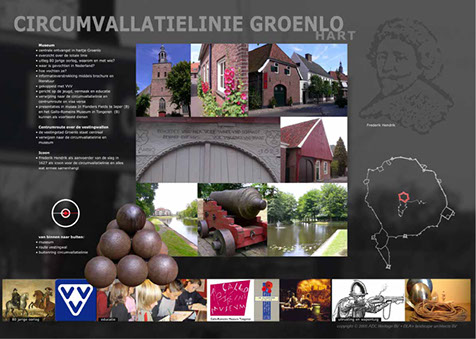 Commissioned by the the former municipalities Groenlo and Lichtenvoorde-Eibergen, Marc Kocken (with ADC Heritage) in cooperation with DLA + landscape architects conducted two studies providing a foundation for the development of the defense line and the fortifications of Groenlo. For various locations concrete suggestions for integration and visualization were developed.